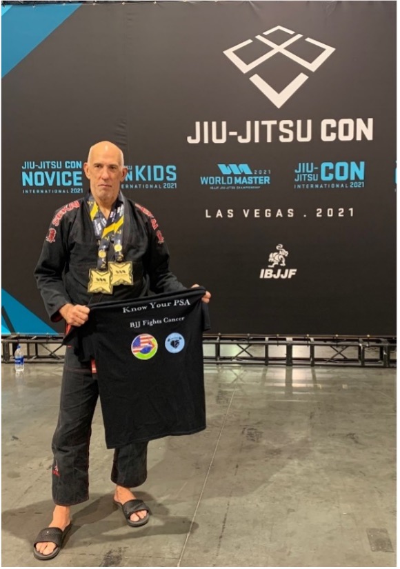 “Always ready” is one of Germain’s mottos. Germain’s cancer had spread beyond the prostate to the seminal vesicles. His Gleason scores were unfavorable, and his post-surgical pathology showed he did not have clear margins. “I must always be ready because, statistically, at least in my head, my cancer has a good chance of reoccurring. So, training for competitions helps me stay ready for any fight. I guess it’s the price I have to pay for being a dumba** and not getting checked out sooner, but Covid’s delay didn’t help either. That’s why I tell all the guys on the mat to know your PSA. Get it checked regularly starting as early as 40 but definitely by 50. You don’t want to be a dumba** like me and get surprised at 60.”