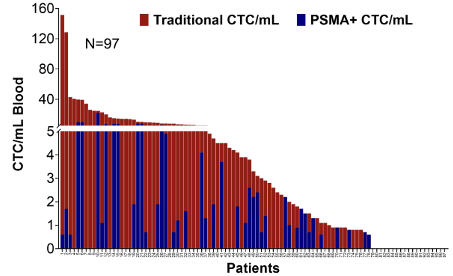 There is a picture that goes with this story. Let’s look at it for a moment. Each line represents one patient in Armstrong’s study. The blue lines represent patients who have PSMA-positive CTCs. Some of the blue lines are long; those men have more PSMA-positive CTCs per mL of blood – some more than 5. Some of the blue lines are short. These men don’t have as many PSMA-positive CTCs.